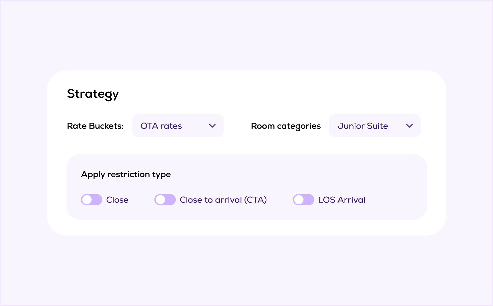 Οι περιορισμοί εφαρμόζονται σε συγκεκριμένες περιόδους, κατηγορίες τιμών ή τύπους δωματίων. Αφού πρώτα οριστούν στην πλατφόρμα, ενημερώνονται αυτόματα στο PMS ή στο Channel Manager. Οι πιο συνήθεις περιορισμοί: